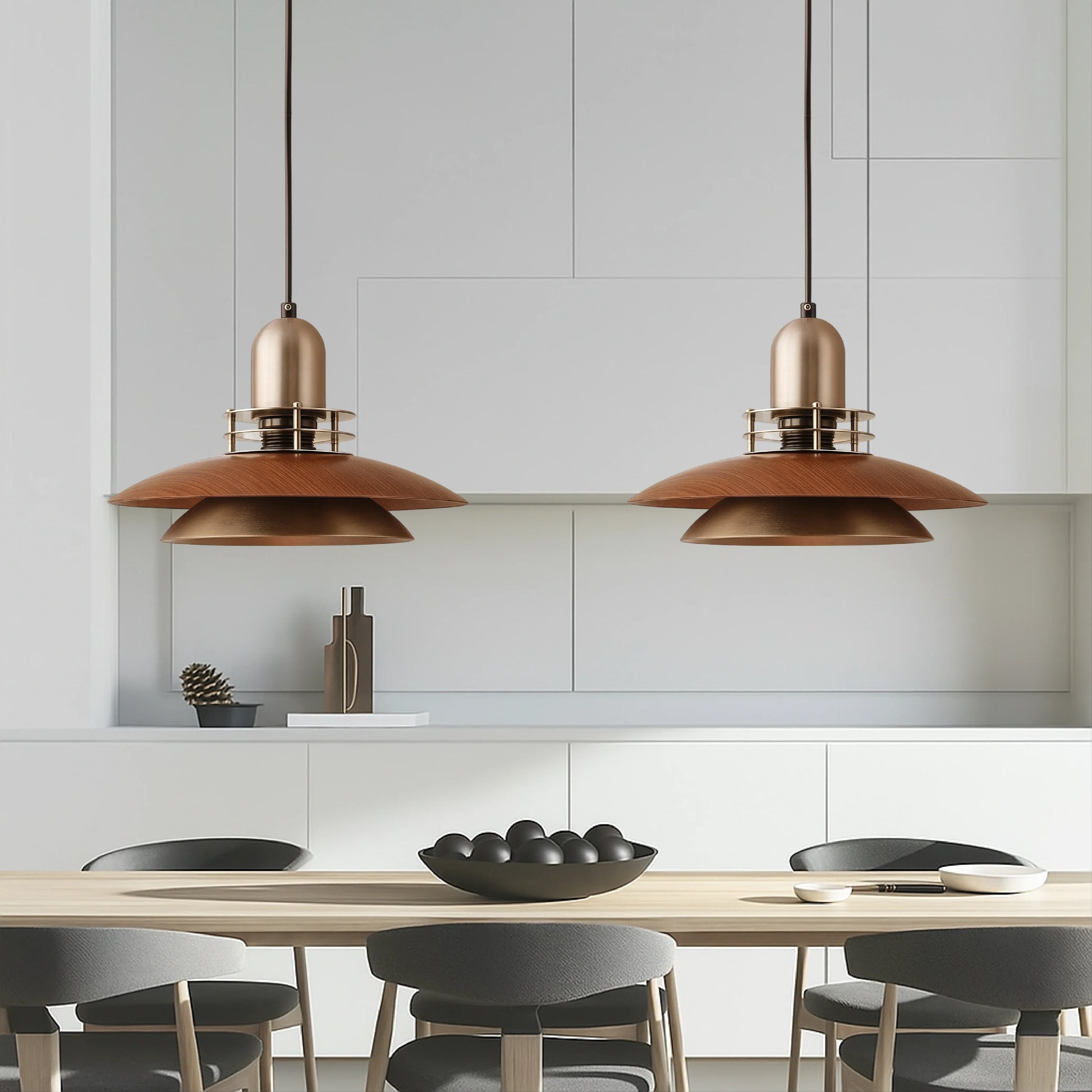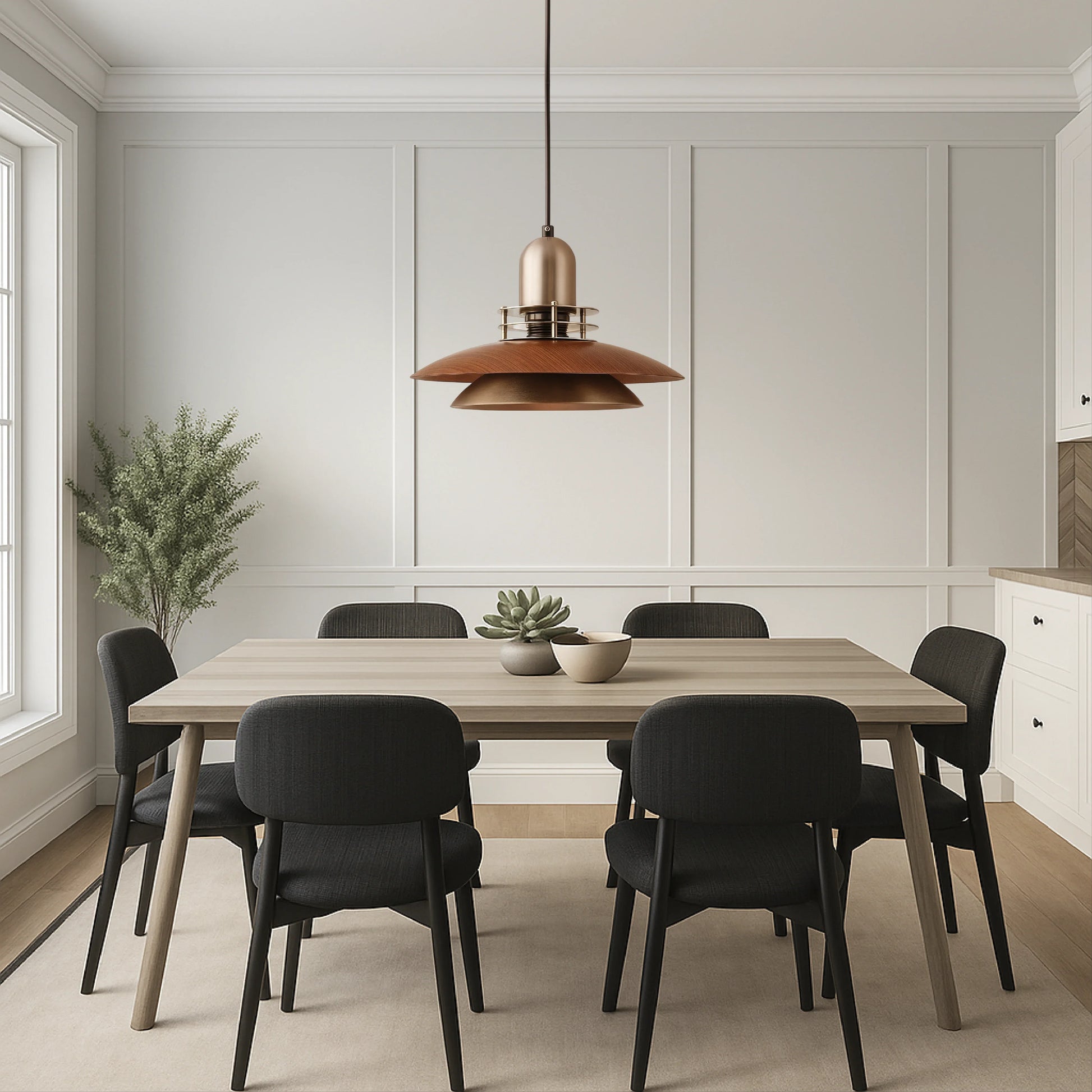 This pendant lamp with its layered walnut design brings natural elegance and depth to your interior. The layers of dark wood create a unique light and shadow effect, creating a warm, inviting ambiance above your dining table, kitchen island, or seating area. Perfect for those who appreciate wood accents, organic shapes, and atmospheric lighting.