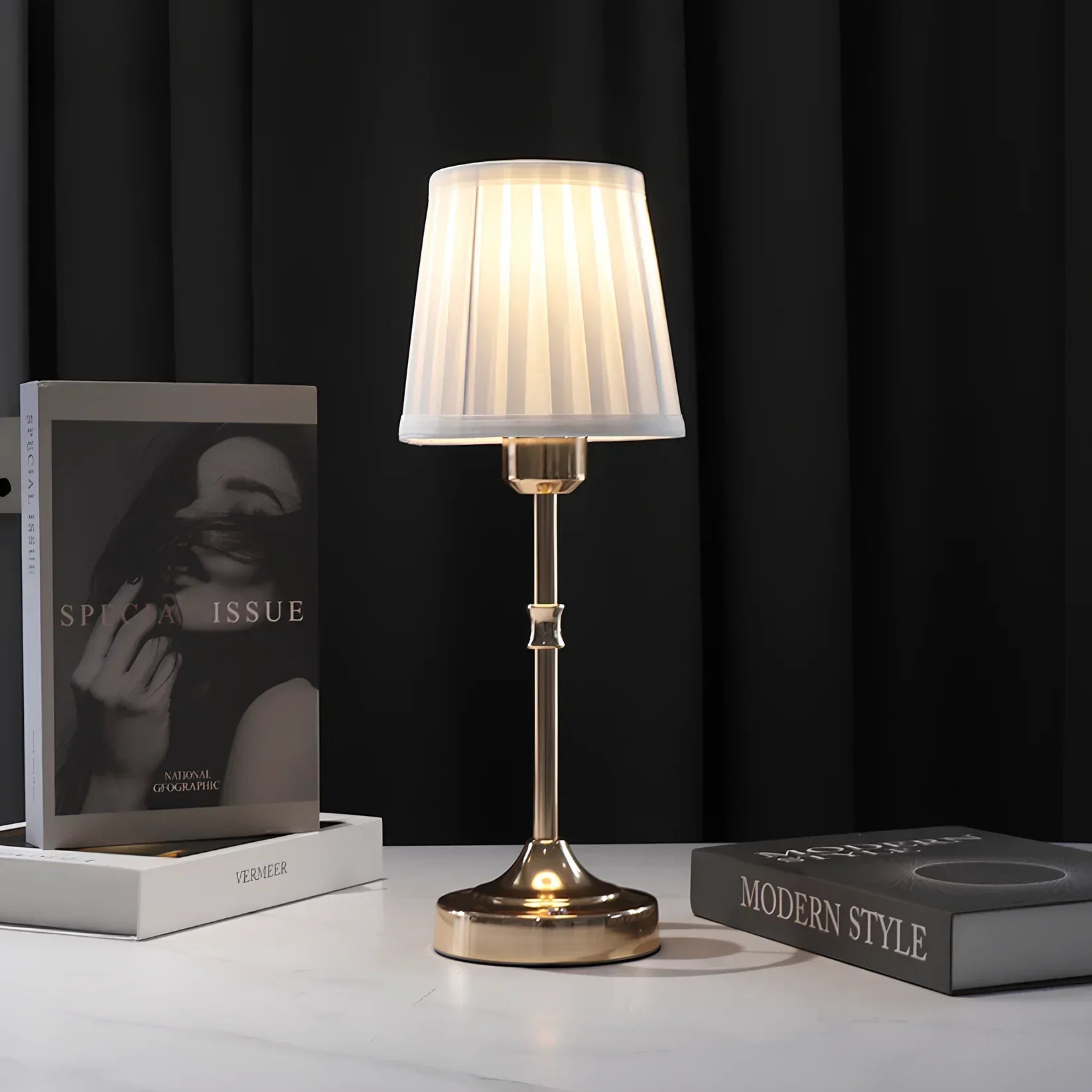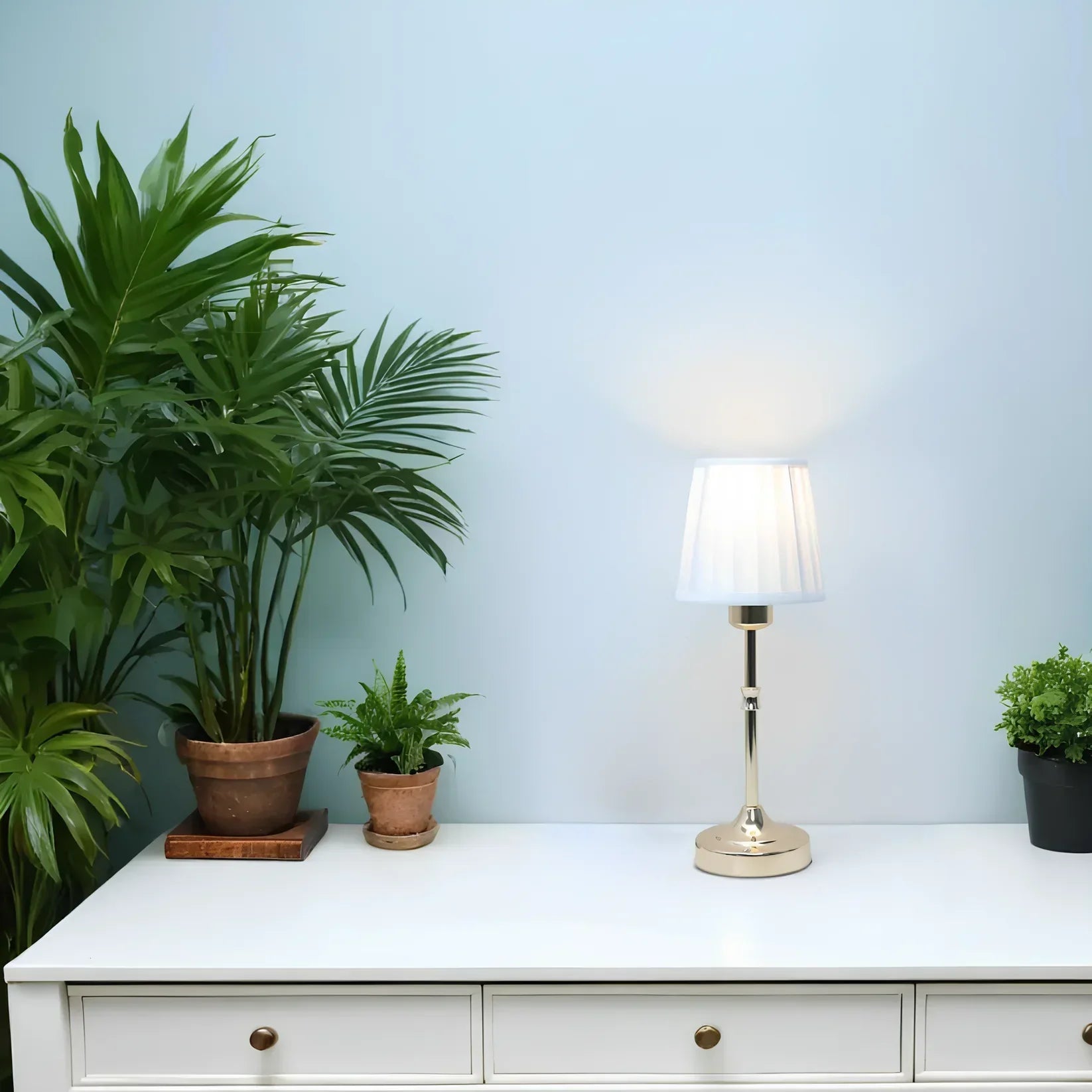 The Classical Grace Table Lamp blends a sturdy iron frame with a soft pleated fabric shade, creating a perfect mix of strength and elegance. Its rechargeable battery allows for wire-free placement, while three lighting colors set the ideal ambiance in any space.