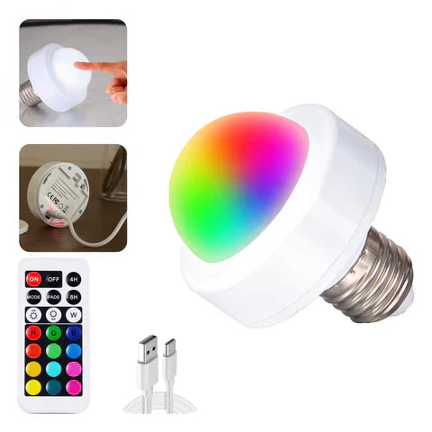 Introducing our innovative Rechargeable Light Bulb. This state-of-the-art lighting solution allows you to transform every lamp in your home into a rechargeable, remote-controlled, dimmable light source with multiple color options. It both enhances your home’s illumination but also aligns with your commitment to sustainability.