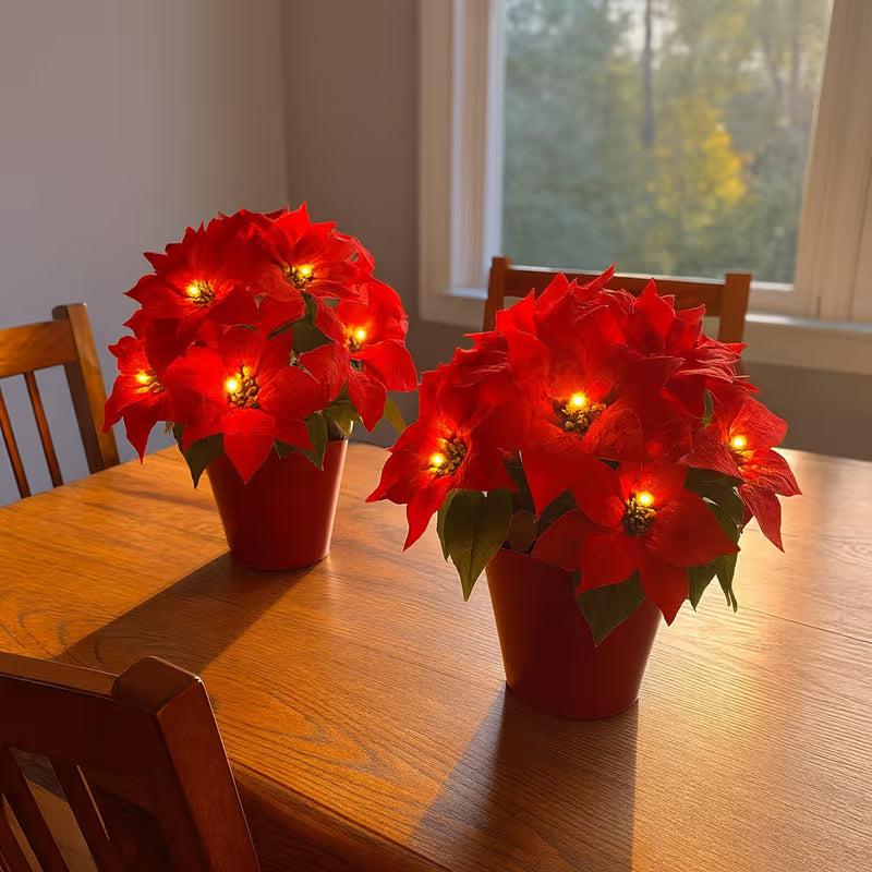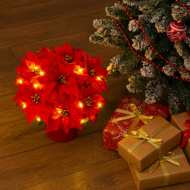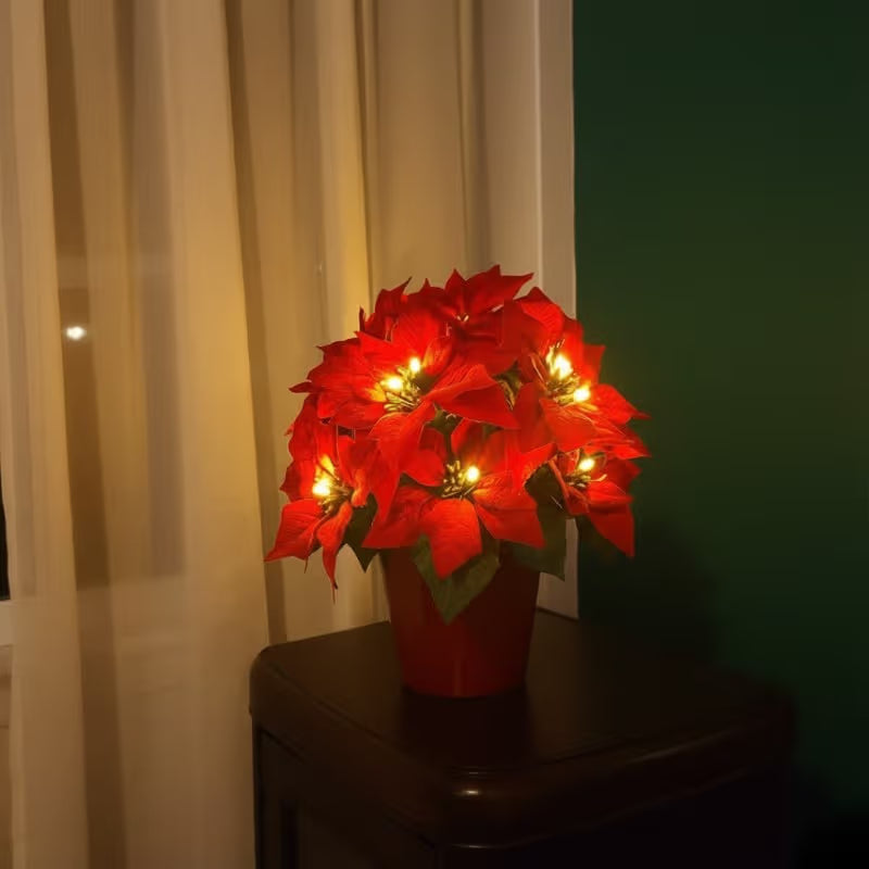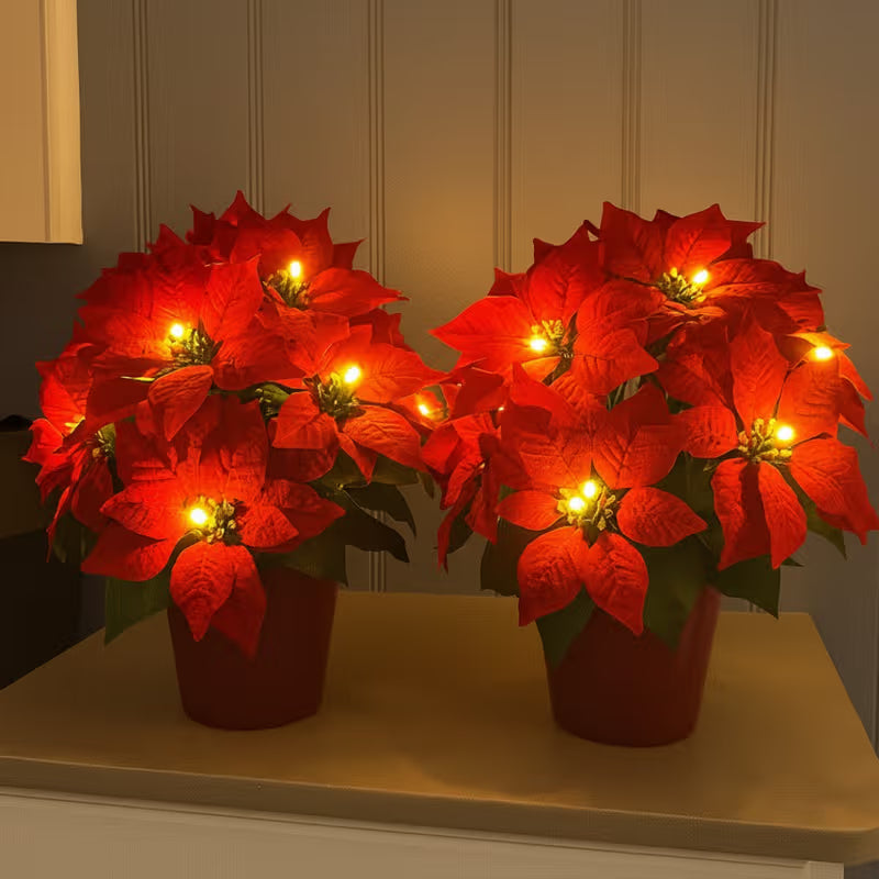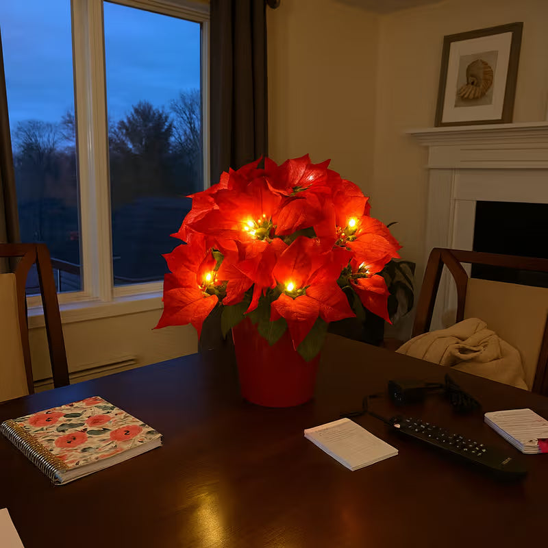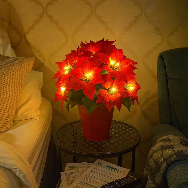 Transform your home with the Radiant Ruby Poinsettia. Its vibrant red petals and soft golden glow bring warmth and enchantment to your holiday season, day or night.