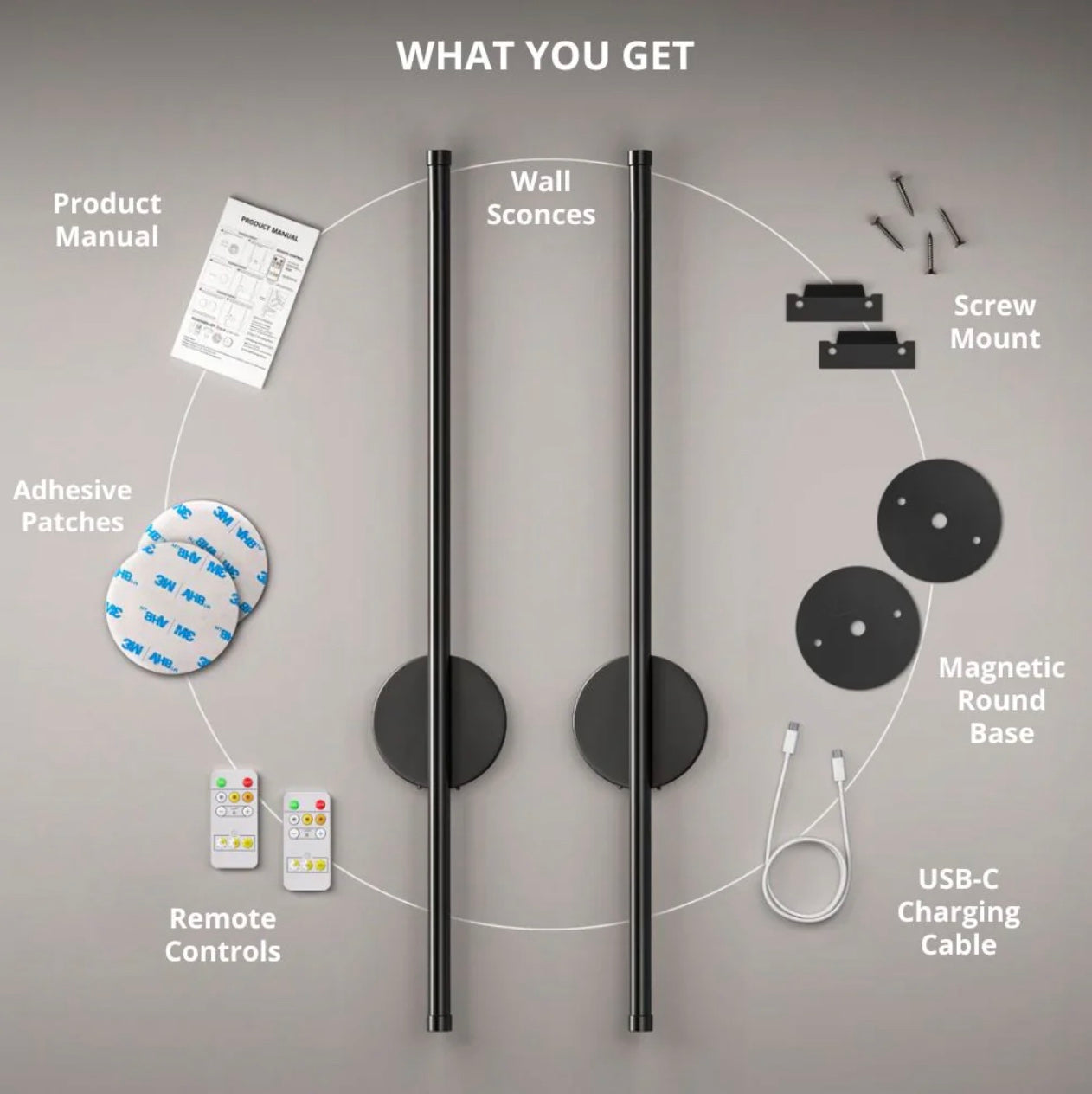Ready-to-Use Kit — Includes 2 sconces, remotes, USB-C cables, adhesive pads, screws, and installation guide.